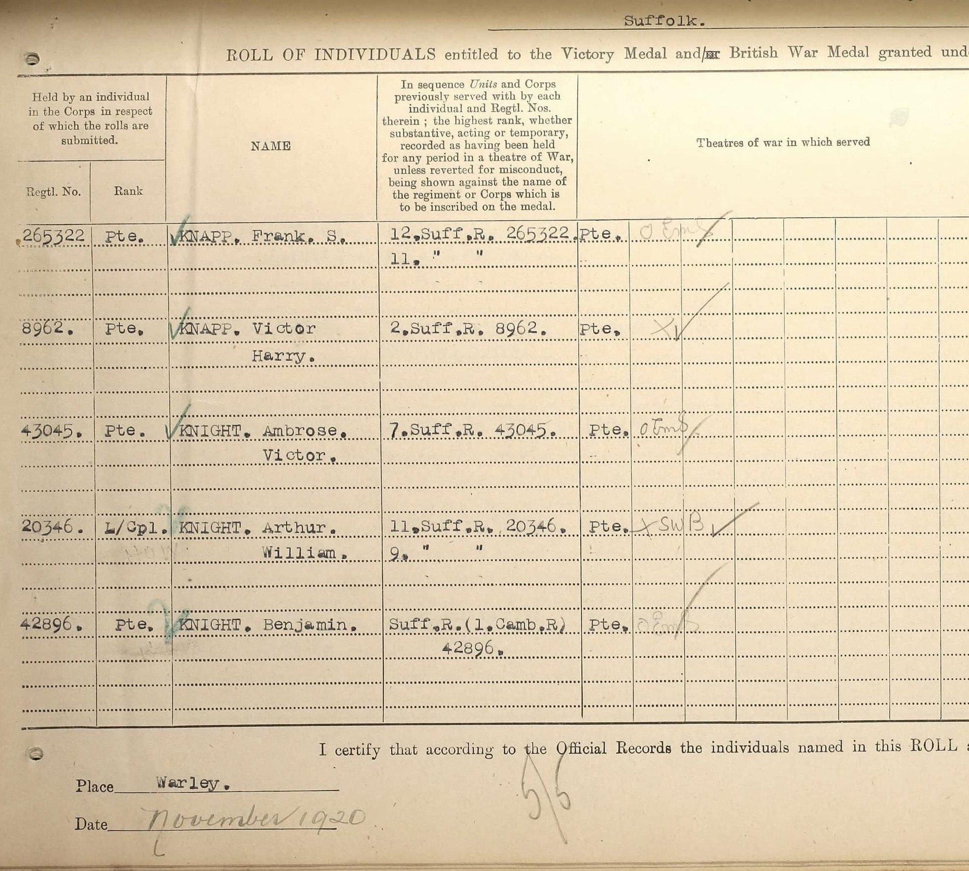 Ambrose was born at Blundeston in 1897, a son of Benjamin and Clara Knight. In 1901 his family lived at The Street, Blundeston, Lowestoft. By 1911 Ambrose's father had died and his family still lived at The Street, Blundeston, and Ambrose worked as a house boy-domestic.